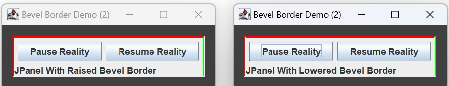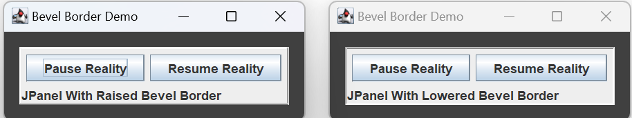 BevelBorders use contrasting colors to simulate shadows, giving a component a 3D appearance. They come in two flavors: a raised bevel border makes a component appear to pop-out from the screen; a lowered bevel border makes a component appear to sink into the screen. When instantiating a new border, the constructor determines whether the border is raised or lowered: