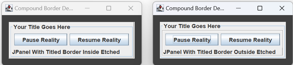 A compound border consists of two borders, one drawn inside the other. Create a compound border using the BorderFactory method createCompoundBorder(BorderoutsideBorder, Border insideBorder). The above figures were generated using the following: