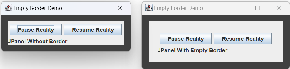 An empty border is invisible. It occupies space, but you can’t see it. Giving a component an empty border is like giving it a margin. Create an empty border by giving it the width of the border on each side of the component, for example: