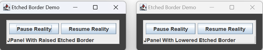 Like bevel borders, etched borders give components a 3D appearance, and can be raised or lowered. The sample etched demos displayed by BorderDemo1 were created using: BorderFactory.createEtchedBorder( EtchedBorder.RAISED );