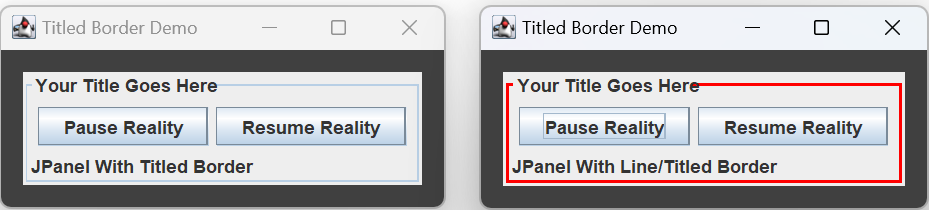 A TitledBorder consists of a base border with text superimposed on top of it. The default base border is a 1 pixel line border. The figure on the left, above, was generated using: BorderFactory.createTitledBorder( "Your Title Goes Here" );
