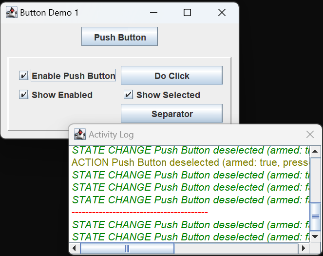 You can get a look at the state changes and events by running application ButtonDemo1 from the project sandbox. This application detects and logs events associated with operator interaction. Start the application, and move your mouse over the component labeled Push Button (but don’t press it). The activity log will show that a ChangeEvent was issued for the push button. When the event was issued, we see that the state of the button is deselected with properties armed: false, pressed: false, rollover: true and enabled: true. It also indicates focus: false. You will see that the visual state of the button has changed to indicate rollover: