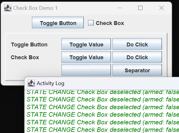JToggleButton is the Swing implementation of a toggle button. The JToggleButton itself is not often used; more commonly used are its subclasses, JCheckBox and JRadioButton. You can see a check box in the figure above; we’ll get to radio buttons later. Toggle buttons support the same states and events as any other subclasses of AbstractButton. You can experiment with this by running JCheckBoxDemo1 in the project sandbox. In this application, if you click on the check box, or call doClick on the check box, the value of the button changes and you get both an action event and an item event. You can also change the value of the button using the Toggle Value button; this will change the value of the button by calling AbstractButton.setSelected(boolean). As noted above, this will generate an item event, but not an action event.