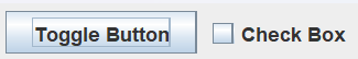 When using images on toggle Buttons you can use one image for the deselected state and another for the selected state. To set the default image in a constructor, use CheckBox( Icon image ); the given image will always be used for a button in the deselected state, and, unless otherwise configured, will also use it for the selected state. To configure an image for a button in the selected state, use AbstractedButton.setSelectedIcon( Icon image ). To set the default image after instantiation, use AbstractedButton.setIcon( Icon image ). To create the first three check boxes in the accompanying figure I used the following helper method: