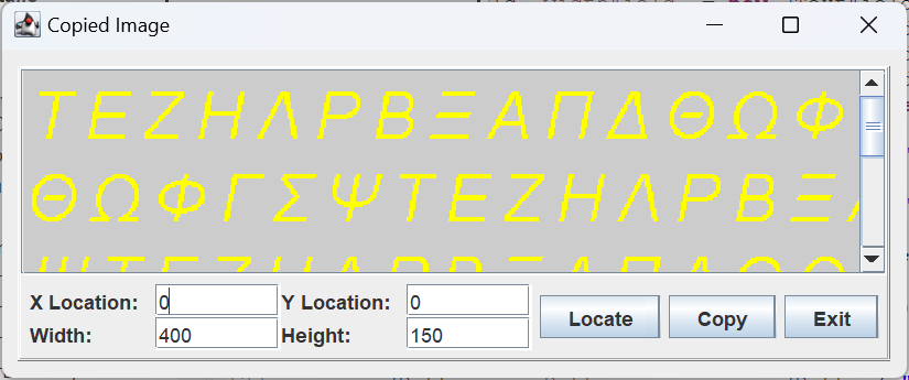 GraphicsCaptureDemo2 from the project sandbox shows how use Robot to do a screen capture. For Robot the source of the capture is the entire screen, not a single window, so the application allows the operator to set the x- and y-coordinates of the capture, in addition to the width and height. Pushing the Location button prints the coordinates and dimensions of each of the application’s windows (and only the application’s windows) to the activity log. If you experiment with this application you’ll notice that the Robot’s capture has some minor imperfections; I have not investigated why this is, or how to improve the process; we won’t be using this facility in the project anyway. Here’s the code from the application that does the capture; all the interesting stuff is in the makeCopy method.