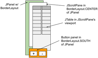 The composition of the VariablePanel GUI begins with a JPanel with a BorderLayout (this panel will be nested in the Outer Panel in the CPFrame content pane; see Introduction on page 1). The center portion of the BorderLayout consists of a JScrollPane with a JTable as its viewport view. The south portion of the JPanel contains another JPanel with a FlowLayout and two JButtons.