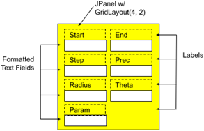The composition of the ParameterPanel GUI is simply a JPanel with a GridLayout(4,2) (this will be at the bottom of the LeftPanel in the CPFrame component; see Introduction on page 1). The JPanel contains seven JFormattedTextFields, each preceded by a descriptive JLabel. The first three text fields must contain valid expressions, the Prec text field must contain a valid integer, and the last three text fields must contain valid variable names.