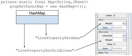 In the main class, we have a static field that maps the class name of a property set (GraphPropertySetMW, LinePropertySetAxes, etc.) to the JPanel containing the GUI