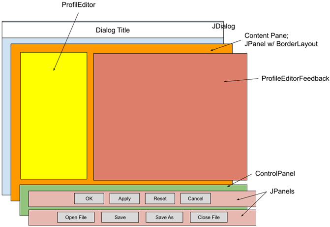 Our dialog’s content pane has a BorderLayout with a ProfileEditor in the West, a ProfileEditorFeedback panel in the Center, and a control panel with two subpanels of four JButtons each in the South.