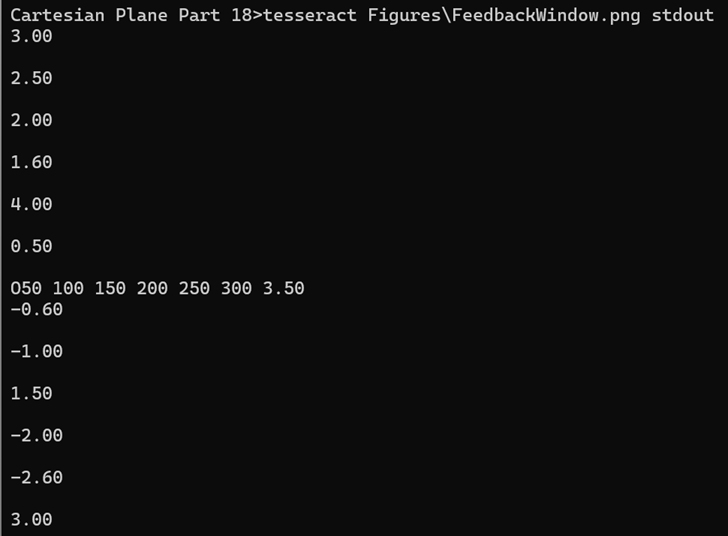 Tesseract is a fully functional command-line program. If you have put the installation directory in your path, point a command line to the project directory for this lesson, execute the following command, and see the result on the right. tesseract Figures\FeedbackWindow.png stdout