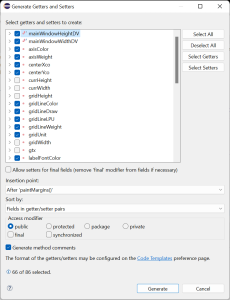 If you’re not looking forward to writing the setter and getter for every one of our properties, you’re in luck. Chances are your IDE will do it for you. If you’re using Eclipse, for instance, pull down the source menu and select Generate Setters and Getters. In the resulting dialog, choose the variables for which you want setters and getters; if you wish, for a given variable you can select just a setter or just a getter. I also suggest you check the Generate Method Comments toggle button; we haven’t started talking about documentation yet, but once we do this will save a lot of typing. When you’re ready, push the generate button.