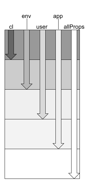 For this test, we’ll divide the properties in allProps into approximately equal-sized chunks labeled chunk 0, chunk 1, chunk 2, chunk 3, and chunk 4. We’ll declare values for the properties in the first four chunks in the application ini file and those in the first three chunks in the user ini file. At this point, every property value declared in the environment is also declared in the user ini file, but some properties are only declared in the user ini file.