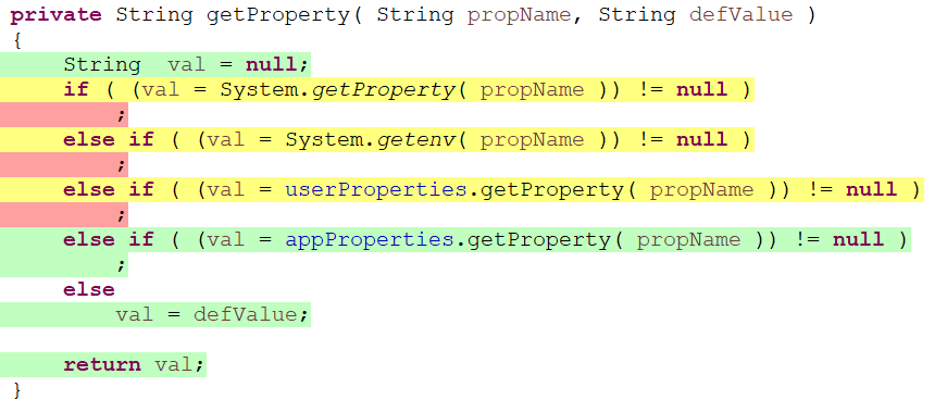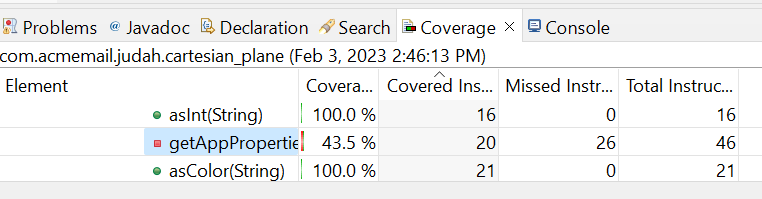 If we check the code coverage metrics, we will see we only get about 87% coverage on PropertyManager. Some of that is in the methods we have yet to test, but a lot of it is in getProperty and the property initialization logic that we tested above. Let’s review some of the places we’re missing coverage.