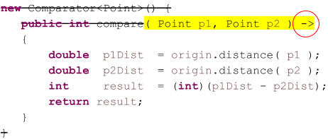 - Knowing that the Comparator<Point> instance has a single abstract method, it could anticipate the block statement comprising the body of the anonymous class, eliminating the need for us to insert the outer braces ({}).